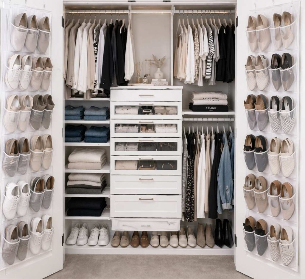42. Combine Multiple Shoe Storage Solutions in One Closet