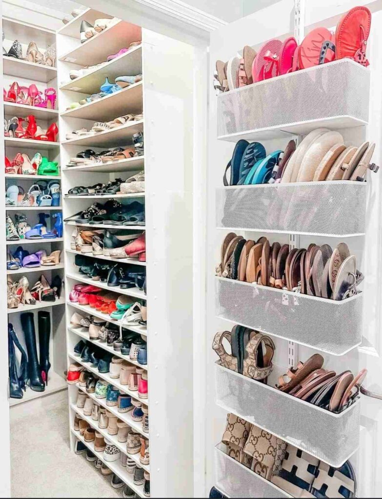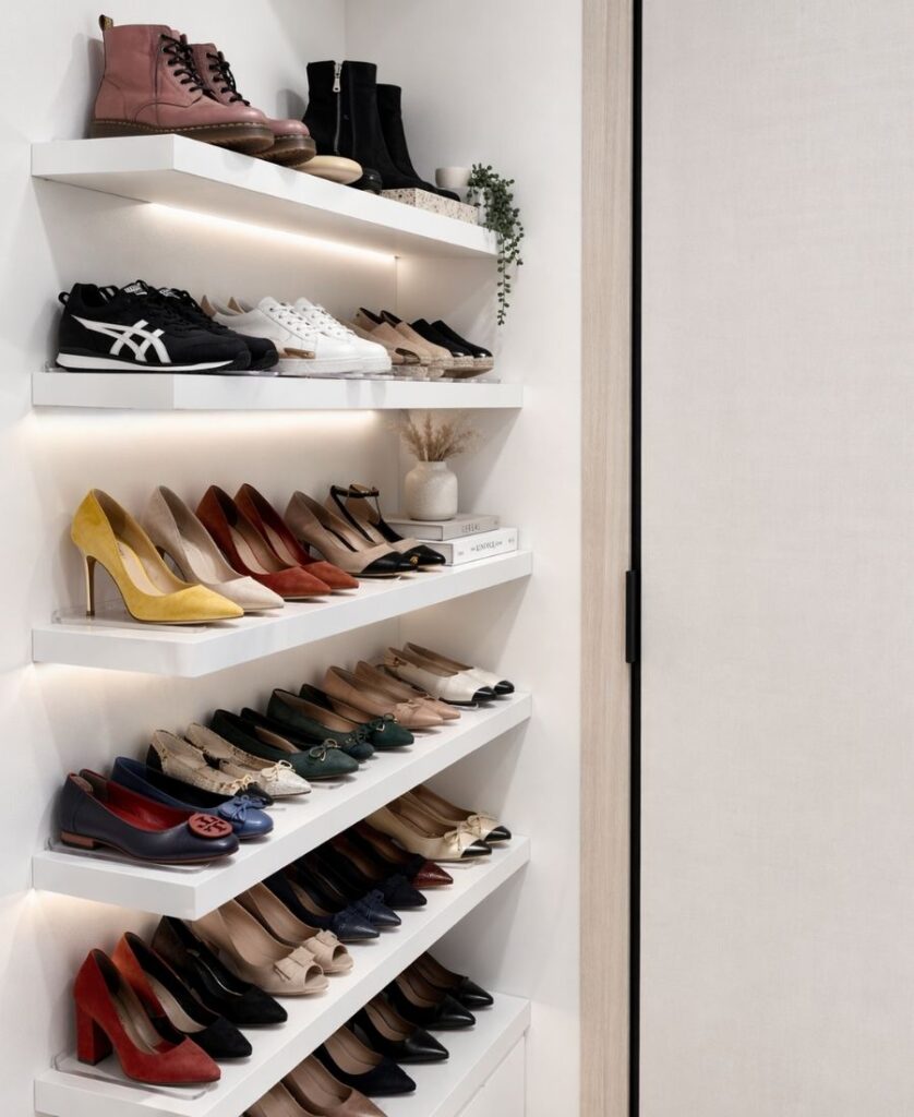 Don’t let that empty corner in your closet go to waste. Consider turning it into a dedicated shoe storage area with corner shelving. This is one of the smartest shoe storage ideas for closets that maximizes every bit of space.