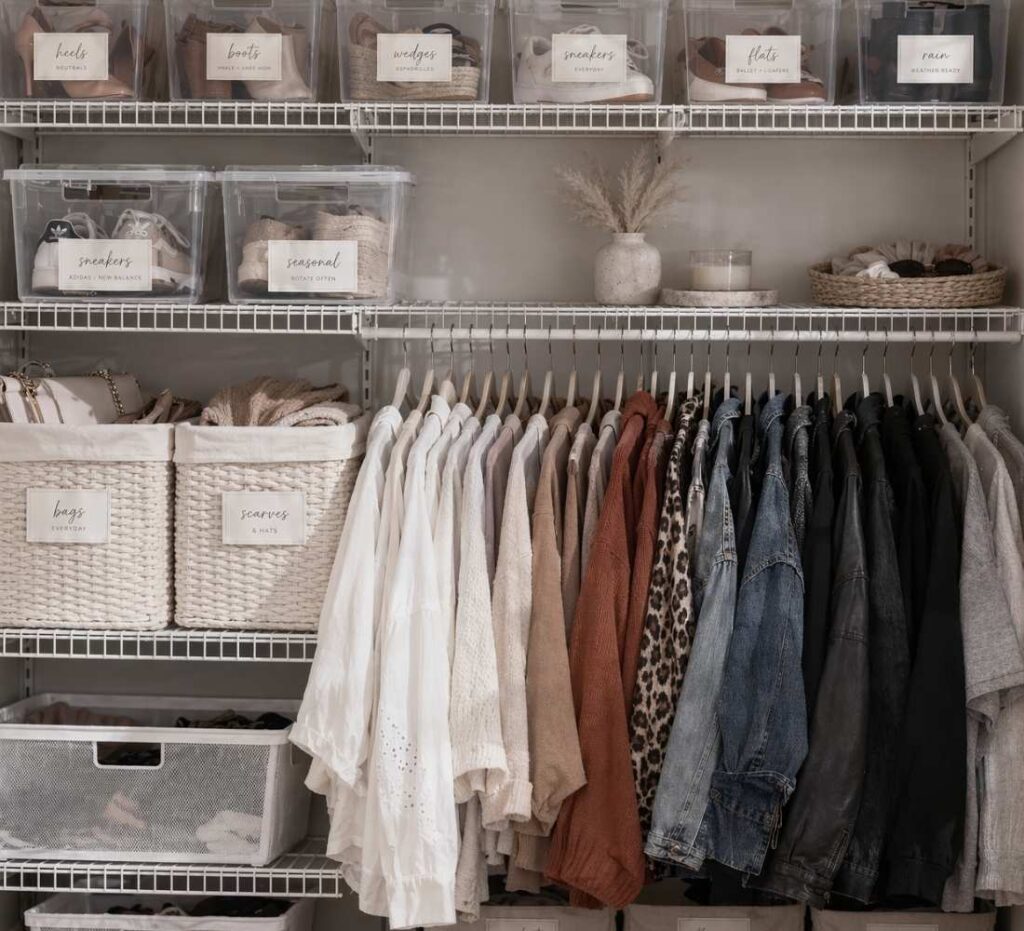 Clear stackable bins are another one of my favorite shoe storage ideas for closets. They are especially great for sneaker lovers, shoe collectors, and people who want to protect their most cherished pairs.